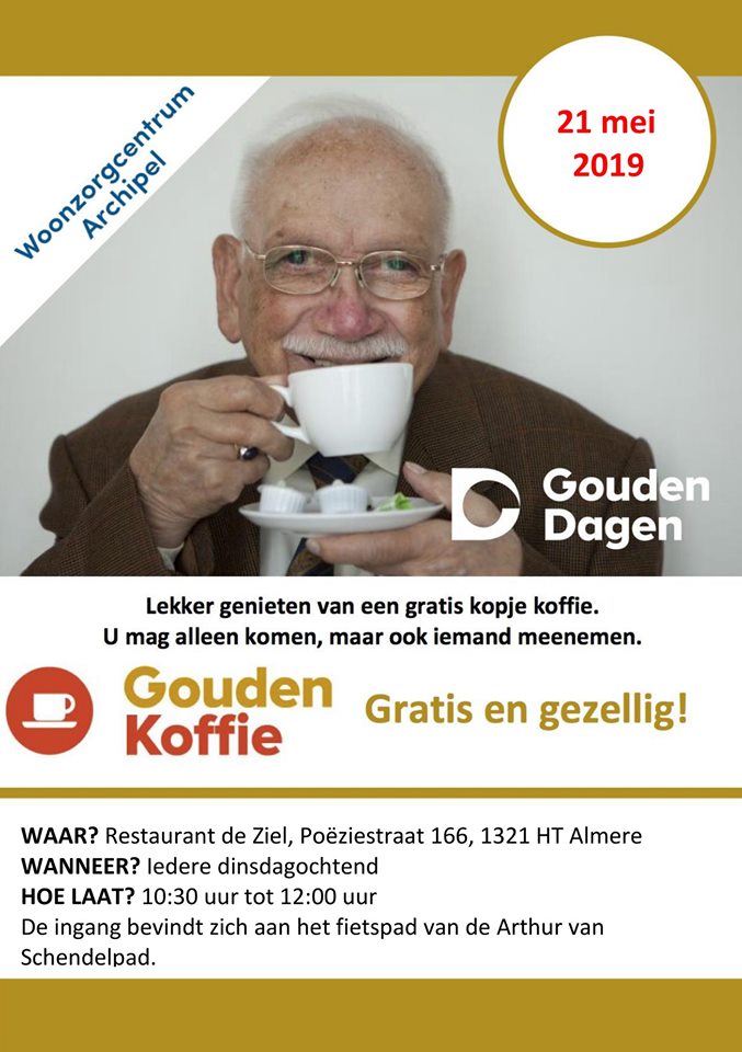 Op dinsdag 21 mei 2019 organiseert Woonzorgcentrum Archipel (Zorggroep Almere) het eerste Gouden-Koffiemoment in café-restaurant De Ziel, Poëziestraat 166 (ingang Arthur van Schendelpad). Dit evenement zal daarna iedere dinsdagochtend om 10:30 uur plaatsvinden in ons restaurant.