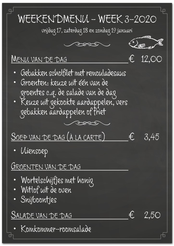 Hieronder treft u het weekendmenu aan van week 3. Het is een aanvulling op onze nieuwe menukaart (winter 2019-2020).
