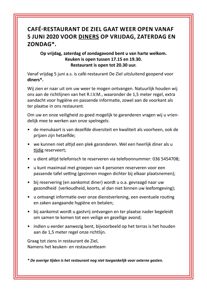 Dit betekent dat wij m.i.v. 5 juni uitsluitend open gaan op vrijdag-, zaterdag- en zondagavond voor het diner. Reservering is altijd noodzakelijk.