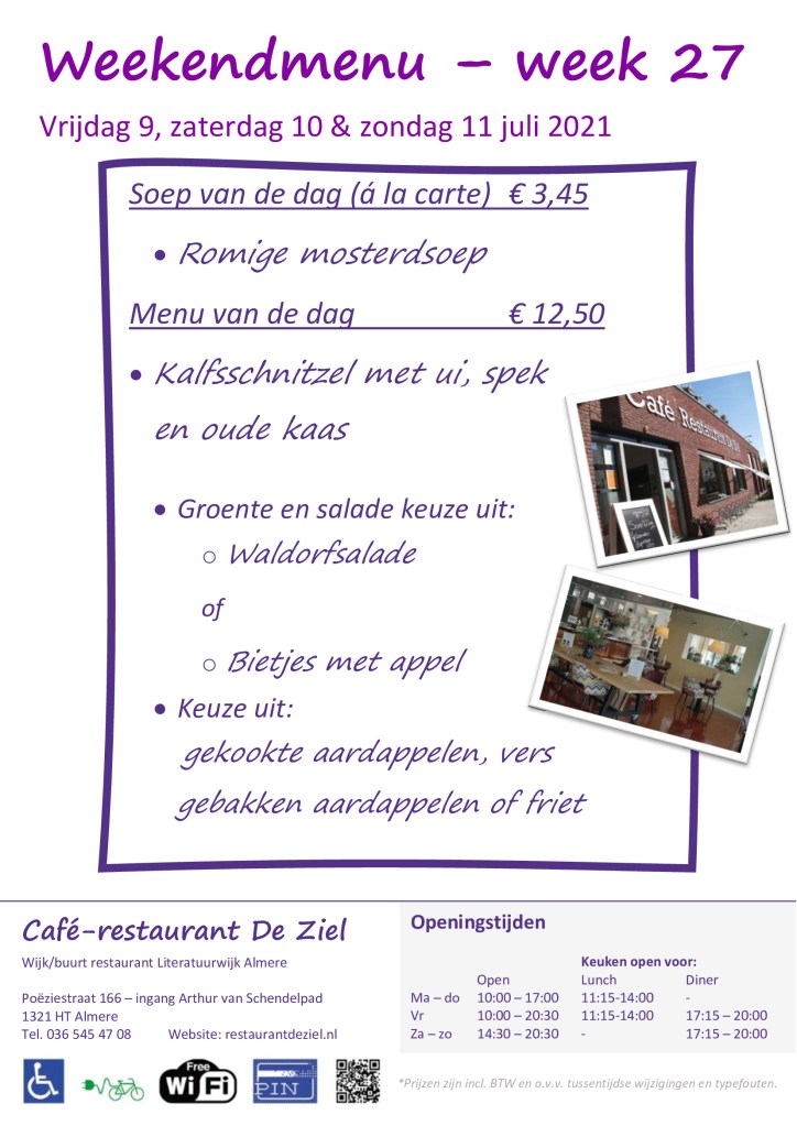 Weekendmenu week 27 behorend bij menukaart diner zomer-lente 2021 (zolang de voorraad strekt)