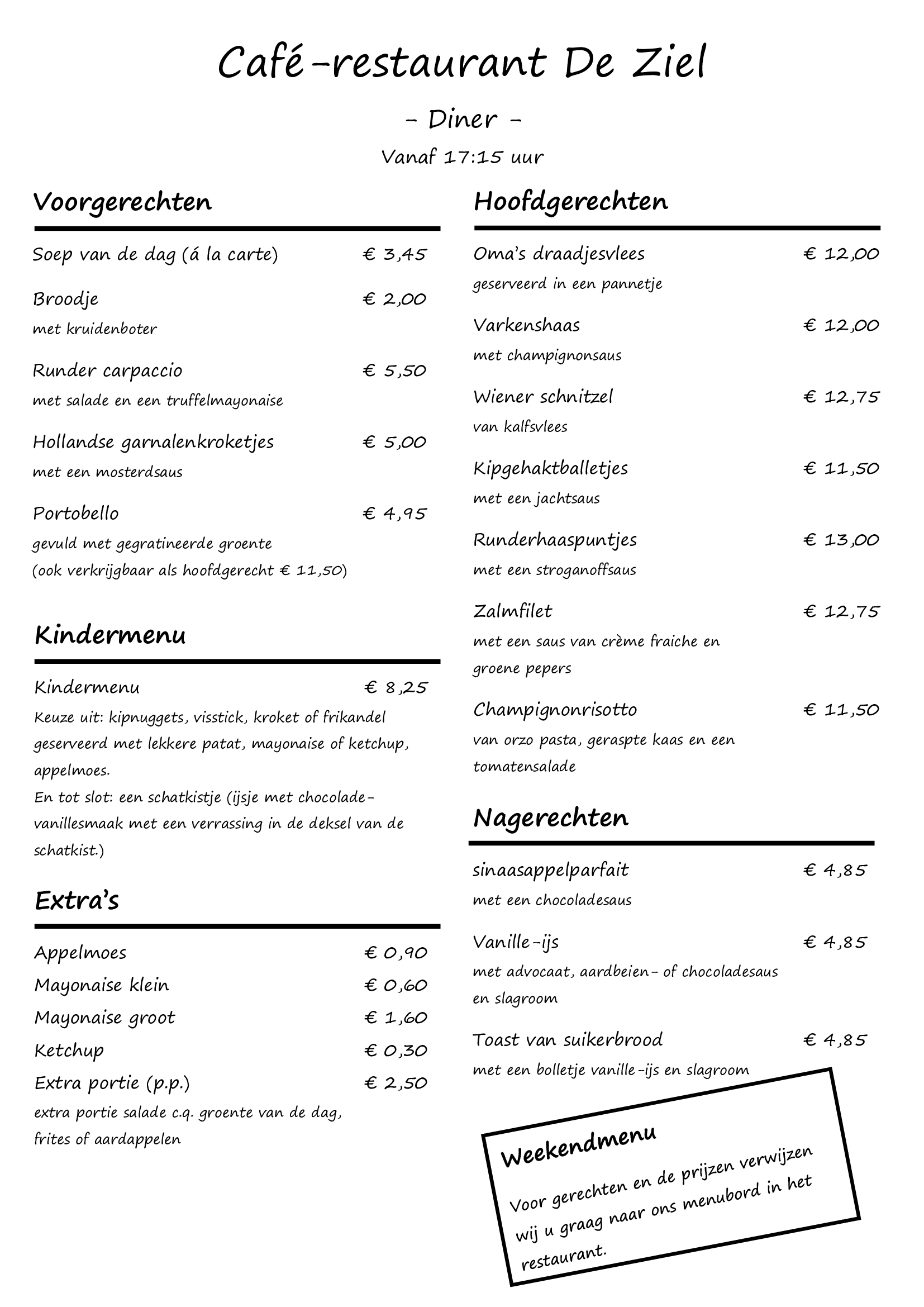 Hieronder treft u ons nieuwe weekendmenu aan, dat geldig is op vrijdag 25, zaterdag 26 en zondag 27 maart a.s.. Het is een aanvulling op onze dinerkaart herfst/winter 2021/2022.