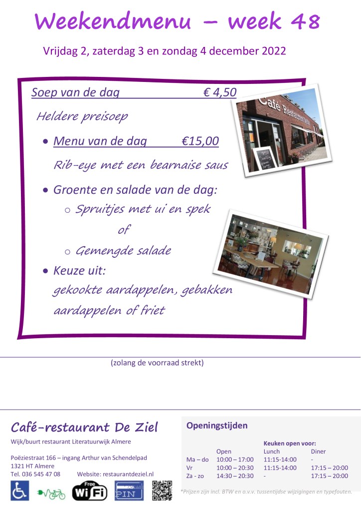 Hieronder treft u ons nieuwe weekendmenu aan, dat geldig is op vrijdag 2, zaterdag 3 en zondag 4 December a.s..