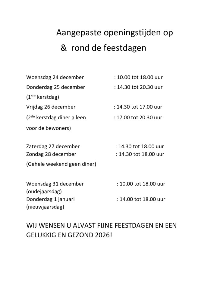 Diner: vrijdag, zaterdag en zondag: 17:15 – 19.30 uur